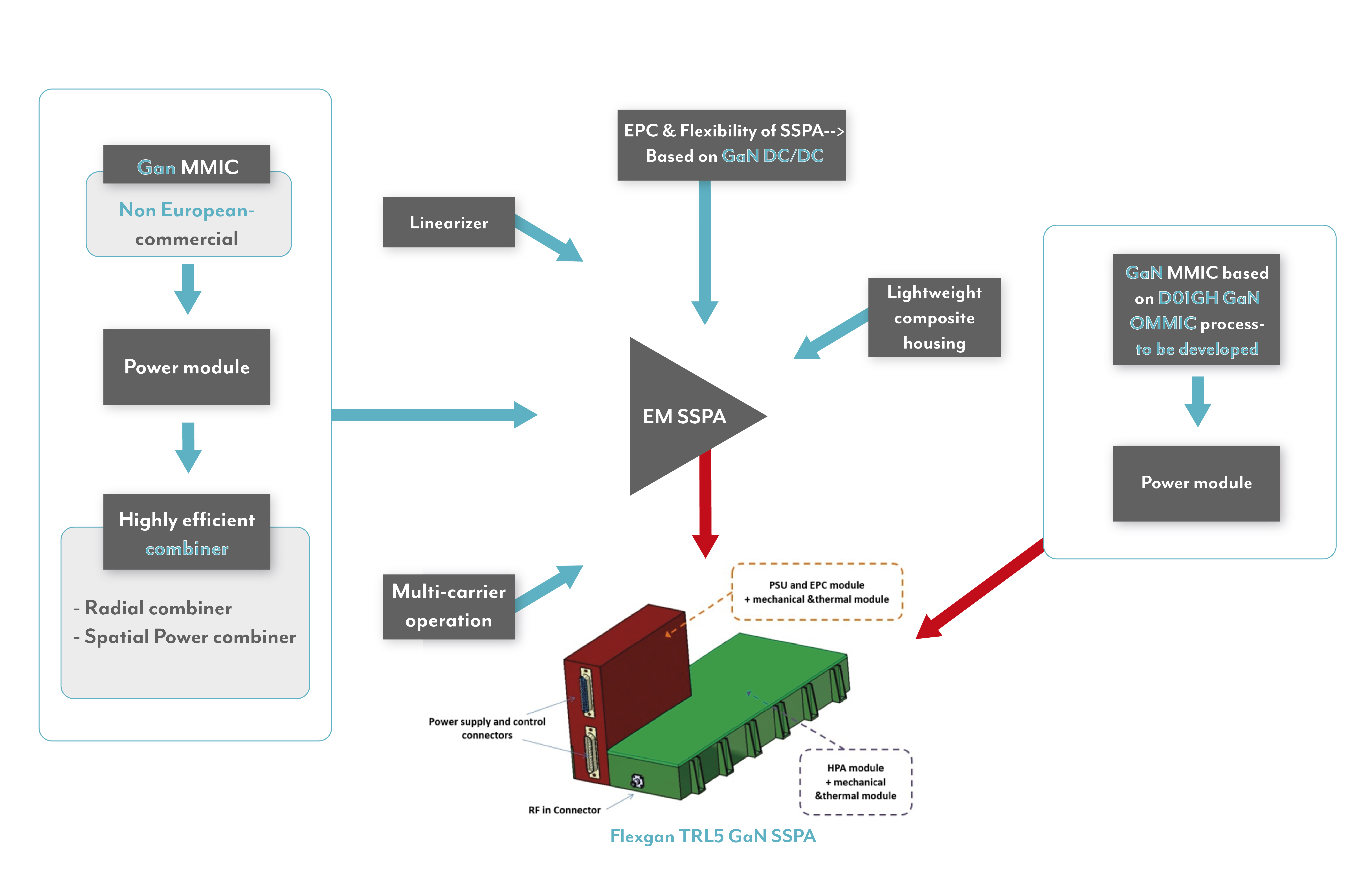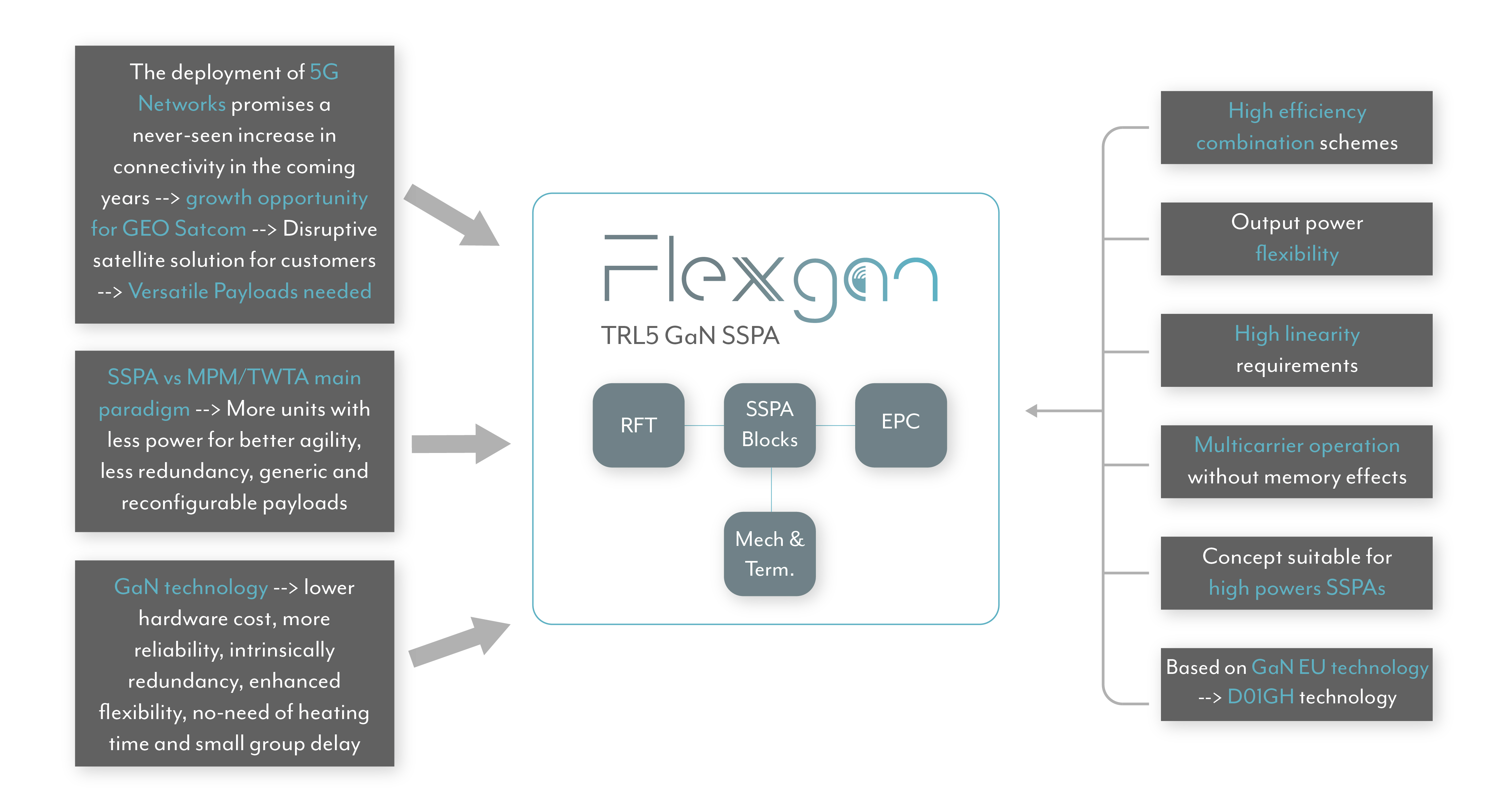 FLEXGAN (Ka-band GaN-based SSPA for FLEXible payloads and multicarrier operation for 5G satellite concept) is a European research project co-funded from EU H2020 programme funds. The project aims at designing, developing and testing, in a representative space environment (TRL5), a low cost high power and efficient Ka-band Gallium Nitride (GaN) Solid State Power Amplifier (SSPA) with RF output power varying capability (flexible SSPA), with high innovative & low loss recombination schemes and with the ability to operate in multicarrier operation mode for highly flexible payloads for 5G satellite applications. The operational frequency band is 17.3-20.2 GHz and the objective output power is 125 W CW.